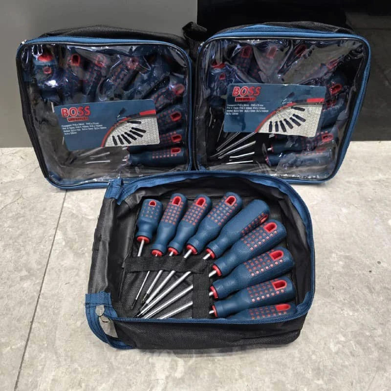 شرکت معتبر BOSS مجموعه 9 عددی پیچ گوشتی دستی را ارائه کرده است . پیچگوشتی ابزاری جهت باز و بسته نمودن پیچ است. عموما پیچگوشتیها به دو صورت برقی و دستی در بازار ارائه میشود. پیچگوشتی دستی از دو قسمت دسته و میله ساخته شده است.« ست پیچگوشتی دستی باس متشکل از9 عدد پیچگوشتی در ابعاد مختلف است تا کاربر بر اساس نیاز کاری از آن استفاده نماید. این ست دارای چهار عدد پیچ گوشتی دوسو (۱۵۰×۸ ، ۱۰۰×۸ ، ۱۰۰×۶ ، ۱۰۰×۳) و پنچ عدد پیچ گوشتی چهار سو ( ۱۵۰×۸ ، ۱۰۰×۸ ، ۱۰۰×۸ ، ۱۰۰×۳ و چهارسوی مشتی ) هست. دسته این پیچگوشتی از پلاستیک فشرده شده استفاده شده است. به دلیل چرخش زیاد پیچگوشتی در حین کارکردن خصوصا کارکردن طولانی مدت، قسمت بالا دسته تراش داده شده تا دست خسته و یا اذیت نشود و دسته حالت ارگونومیک خود را حفظ نماید و به راحتی در دست قرار گیرد. همچنین جهت کاهش لغزش دست بر روی دسته پیچگوشتی، دسته به صورت شیار دار ساخته شده است. میله پیچگوشتی از آلیاژ کروم وانادیوم (CR-V) ساخته شده تا استحکام میله افزایش یابد. این آلیاژ در مقابل فشار، حرارت، ضربه و حرکات پیچشی مقاومت بالایی دارد. همچنین با اعمال عملیات گرمایشی استادارد بر روی میله از خورده شدن نوک پیچگوشتی جلوگیری میشود. همچنین تمام پیچگوشتیهای مارک اکتیو دارای نوک آهنربایی نیز است. میله این پیچگوشتی شش گوش هست تا از چرخش احتمالی میله پیچگوشتی در داخل دسته (در هنگام فشار زیاد به پیچگوشتی) جلوگیری میشود. همچنین میله دارای قابلیت آچارخور جهت پیچاندن میله در شرایط سخت نیز است. همچنین میله این پیچگوشتی جهت افزایش مقاومت میله دربرابر زنگ زدگی، میله با روکش ساتن کروم آبکاری شده است. این مجموعه پیچگوشتی 9 عددی دارای یک کیف مقاوم وشفاف پلاستیکی-برزنتی که در اختیار مصرف کنندگان قرار میگیرد. همچنین در قسمت انتهایی این کیف نیز از برزنت استفاده شده تا کیف به راحتی پاره نشود.