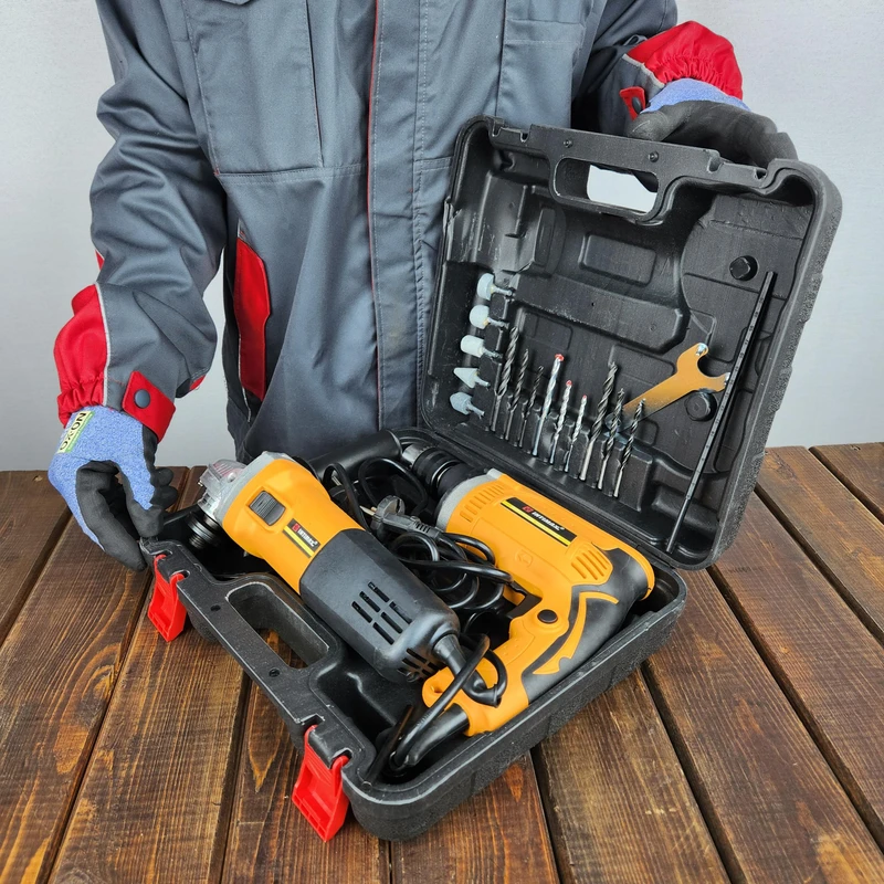 این مجموعه دارای یک عدد دریل نیمه فلزی و یک عدد مینی فرز کلید بغل می باشد. مناسب افرادی است که مجموعه دو دستگاه را در یک کیف میخواهند و مجموعه ای بسیار مفید و کم حجم است. دریل این دستگاه دارای توان 1300 وات، سرعت چرخش 0 الی 3000 دور بر دقیقه و دارای حالت چکشی می باشد. همچنین سه نظام این دریل 13 میلیمتر است. از طرفی دیگر مینی فرز این مجموعه دارای توان 1400 وات،سرعت چرخش 10800 دور بر دقیقه و قطر صفحه 115 میلیمتر می باشد. کلید مینی فرز این مجموعه از نوع کلید بغل می باشد که کارکرد آن را ساده تر و دلچسب تر از انواع کلید پشت کرده است. کیفیت هر دو دستگاه بسیار مطلوب و سیم پیچ آنها تماما مس می باشد که دوام این دستگاه را تضمین میکند. این مجموعه نشان CE اروپا را دریافت کرده و همچنین دارای تعدادی مته الماسه جهت بتن و سنگ، تعدای مته چوب و تعدادی مته آهن، و تعدادی سری سنگ انگشتی می باشد. تمامی این موارد خرید این دستگاه را جذاب و منطقی کرده است.